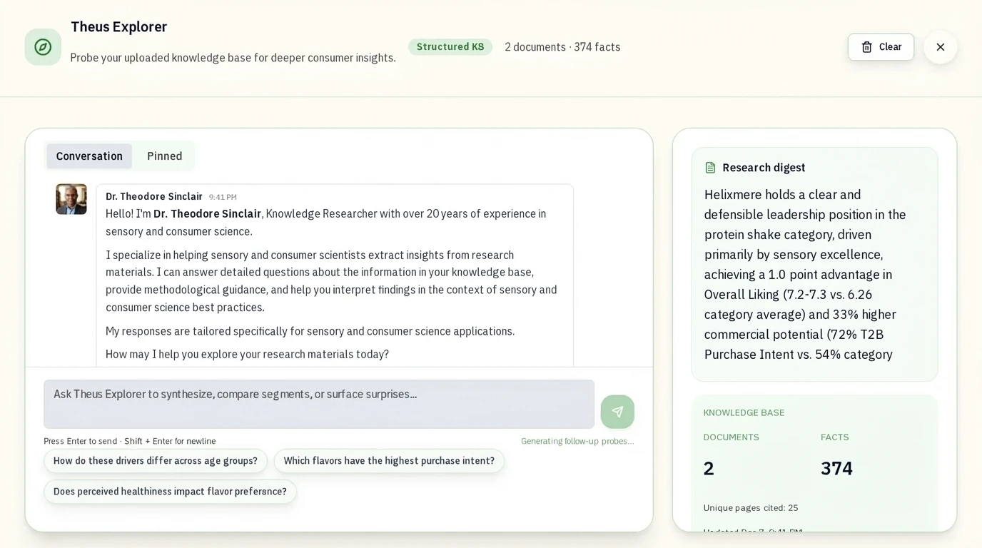 More than 60 years of combined experience in consumer insights and sensory science, paired with AI systems that preserve provenance, interpretation, and nuance.